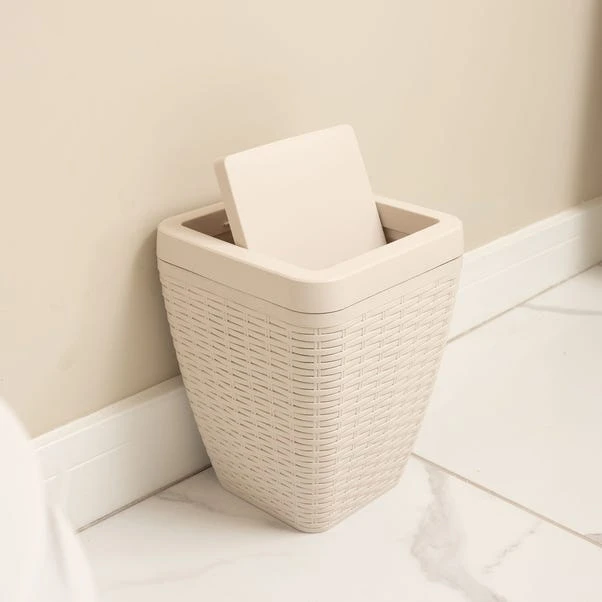 Featuring a faux rattan weave design in a cream tone, this Addis toilet set includes a toilet brush and a flip top lid bin with a capacity of five litres, crafted from hardwearing plastic.