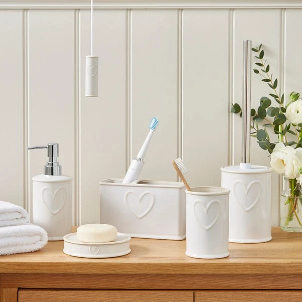 Showcasing an embossed heart, the Country Hearts Toothbrush Holder is sure to add some personality, and charm, to your living room. With ample space, this piece will be able to hold multiple brushes at once.