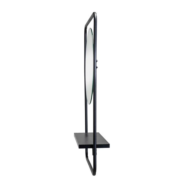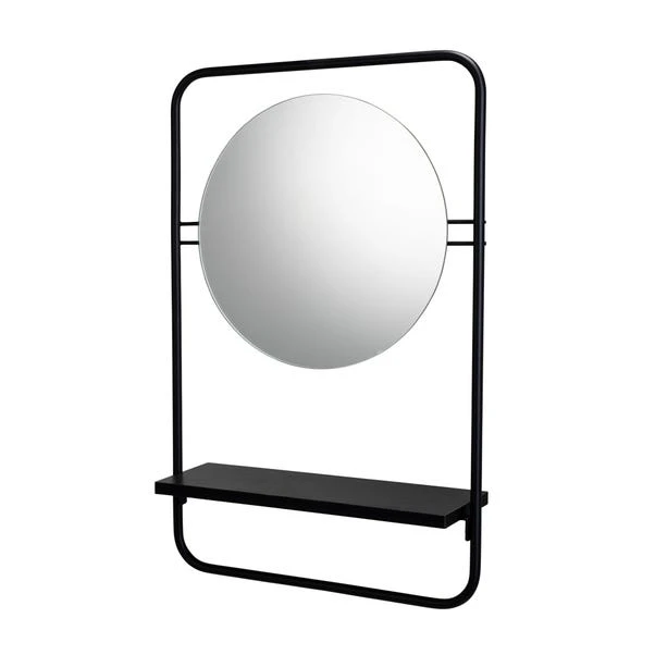 Enhance any room with the Furzton Round Mirror featuring a Matt Black Frame and Shelf. This contemporary mirror boasts high-quality glass and a stylish matt black steel shelf for convenient storage. Perfect for any room in the house, it adds both functionality and style to your space.