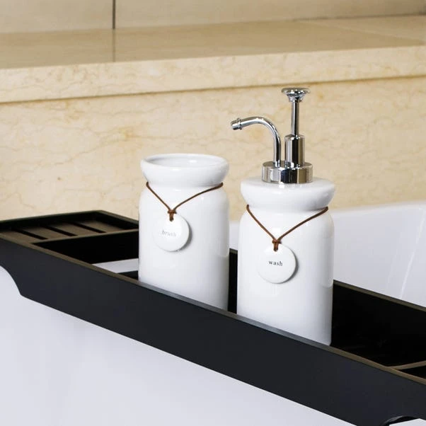 Finished in white and featuring a chrome pump, this ceramic lotion dispenser features a simple design with a hanging tag detail.