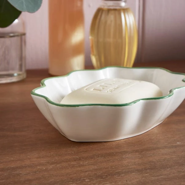 Inject some whimsy into your bathroom decor with this delightful soap dish, showcasing a scalloped design in a white hue accented by a lively green touch. A part of the Heart and Soul collection, it’s part of a set of coordinating items, enabling you to fashion a unified and charming bathroom aesthetic.