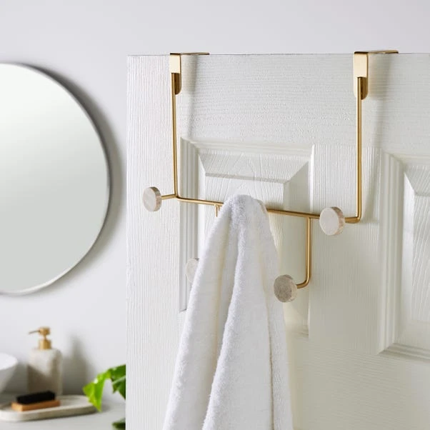 Add functional storage to your bathroom with no drilling required with this multi hook over the door solution. Simply hang over the door to keep your towels and dressing gowns stored neatly away. The marble effect design and gold colourway are chic touches, and there is a single hook version also available.