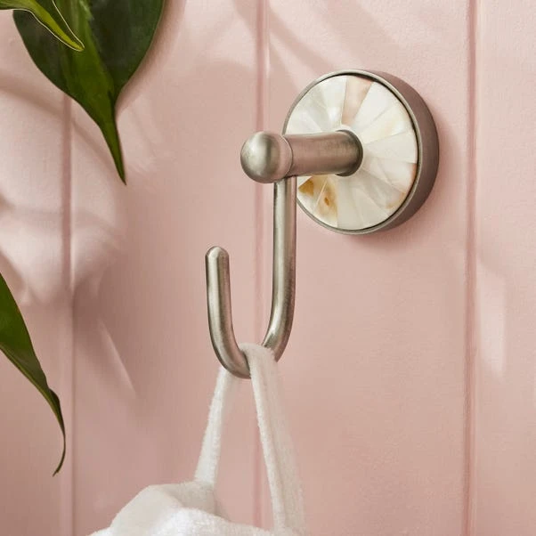 Kepp your towel within reach with this handy towel hook. Finished in brushed chrome and with real Mother of Pearl in the design, it’s a subtle touch of luxury for your bathroom, ideal for just outside the shower or bath. It’s simple to wall mount and is rust resistant to keep it looking fresher for longer. Other items are available in the range for a cohesive look.