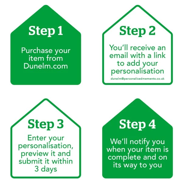 By ordering a personalised product, you are agreeing that your details (name and contact details, including address) and the details that you provide of any other party, such as the recipient of the personalised product, can be shared with our third party supplier who provides the personalisation service only for the purposes of completing the personalisation service and delivering the product to you or the recipient. Our Privacy Policy is here:Privacy Policy | Dunelm.