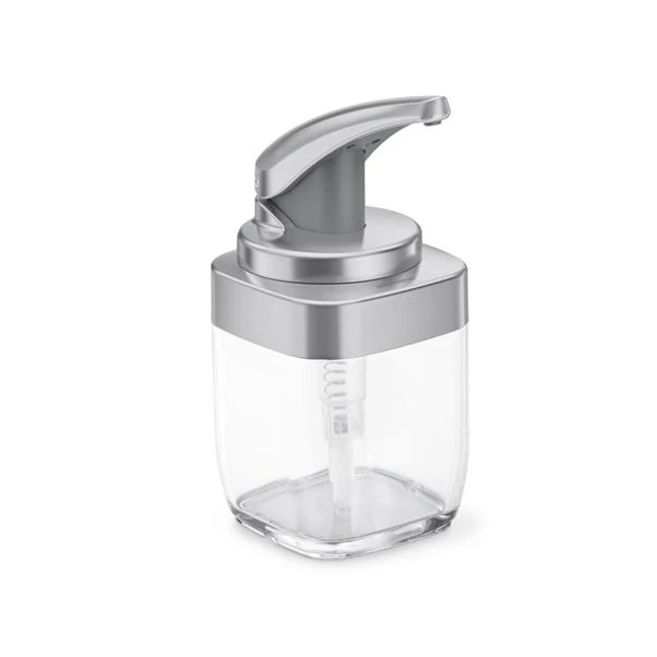 The simplehuman brushed nickel square push soap pump has a precision lever that is engineered for precise, effortless dispensing with just one hand: press lightly for just a little soap, press down farther to get even more.