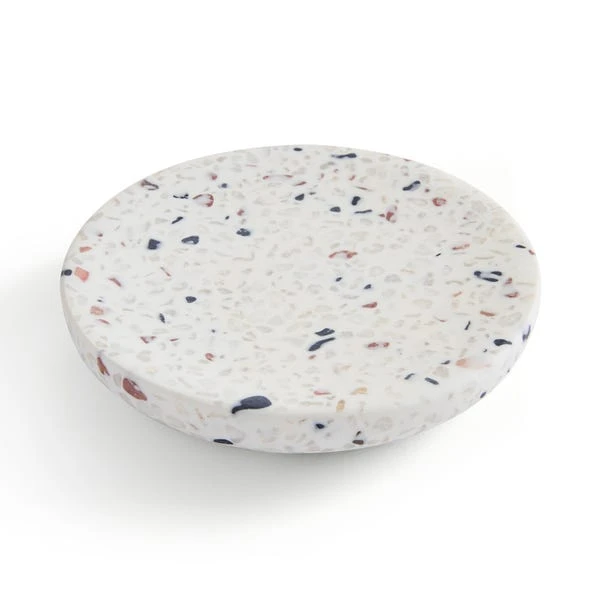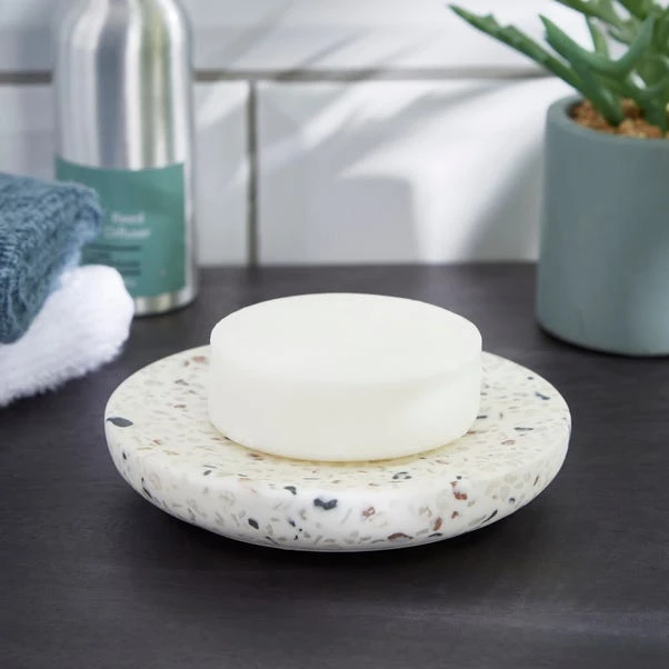 Upgrade your bathroom with this Terrazzo Soap Dish, meticulously crafted using reused resin pieces, boasting a luxurious design ideal for storing household soap. Corresponding items are available to complement your bathroom decor seamlessly. This series, constructed from recycled resin materials with small pebbles added inside, exudes a unique terrazzo design that imbues the collection with a high-end and natural feel.